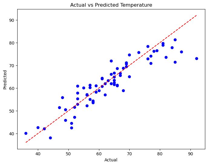 The scatter plot below compares actual versus predicted temperatures generated by a random forest predictive model and provides a visual representation of how well the model performs in forecasting temperatures. Each point on the plot represents a specific instance where the temperature was predicted by the model and the actual temperature observed. Ideally, if the model's predictions are accurate, the points should align closely along a diagonal line from the bottom-left corner to the top-right corner of the plot, indicating a strong correlation between the predicted and actual values. Deviations from this diagonal line suggest discrepancies between predicted and actual temperatures, providing insights into areas where the model may need improvement or further refinement.
