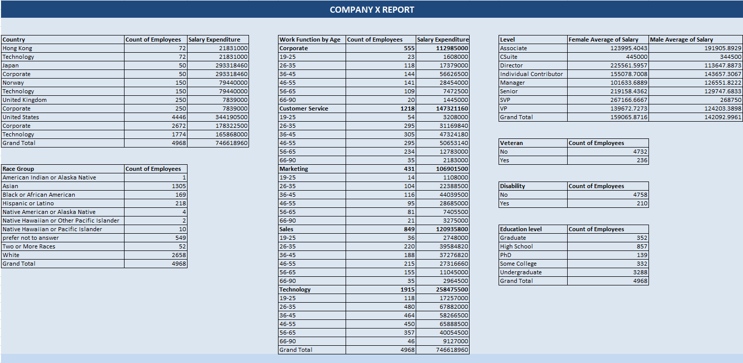 As an alternative view to reporting using pivots, we can also visualise the data as a dashboard using LookerStudio. Why this is really cool is because its linked directly to the Google Sheet document housing the data, so as the data updates (e.g. a new employee being hired) this will dynamically reflect in the dashboard. The dashboard below is embedded unlike the previous project, so it allows for interactivity, please give it a try!