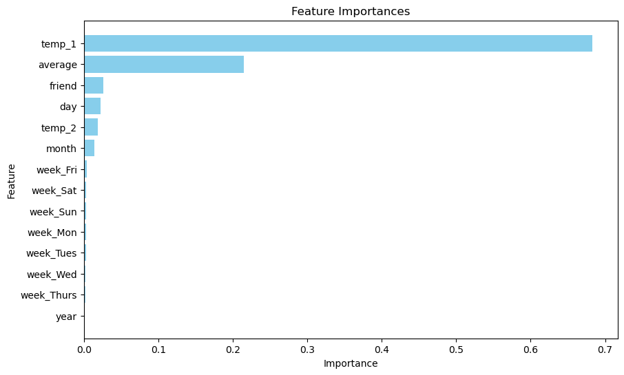 The results of our analysis indicated that I was able to develop a robust model that was capable of predicting the weather with 82% accuracy. Hmm, not too bad, I do believe with some tuning we may be able to improve this number, but nonetheless. Below you'll find a bar chart that lists the 'importance' of each feature (these were the columns in the dataset, we could call them variables as well) in predicting the tempreture. Remarkably, the temp 1 (recording of weather station 1) had a higher importance as opposed to the average temp (the average between temp 1 and temp 2), indicating that weather station 1 generally reads the tempreture with higher accuracy.